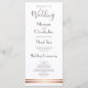 Um moderno programa elegante de casamento branco que inclui duas listras de cobre/rosa no fundo do cartão. A cerimônia e os obrigados de casamento foram incluídos na frente do programa, enquanto todos os festas de noiva foram incluídos no verso.