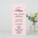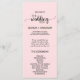 Este simples programa de casamento de caligrafia cor-de-rosa é perfeito para um casamento elegante. A design apresenta uma fonte romântica e doce e cursiva fluindo sobre um adorável e delicado fundo rosa-balé claro. Inclua o nome da noiva e do noivo, a data e o local do casamento, a mensagem do obrigado, a ordem do serviço, a festa noiva e um memorial "em memória amorosa" opcional.