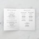 Este programa de cartão dobrado apresenta uma fotografia favorita como fundo do cobrir sob nome, data e local. As páginas de dentro permitem tanto um extenso programa de cerimônias como uma lista de todos os membros do partido noivo e pessoal adicional envolvido na cerimônia. Finalmente, o verso do cartão tem texto perfeito para uma nota final de gratidão aos convidados e um lugar para lembrar os nomes da família e dos amigos que não estão mais lá para celebrar.