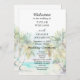 Este elegante e belo programa de casamento de aquarelas mostra uma praia, céu azul e palmeiras. O texto combina o script manuscrito e as fontes sans serif para uma aparência na moda e moderna. Isto é perfeito para uma praia de verão ou um casamento de destino tropical.