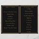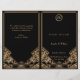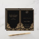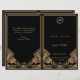 Um elegante programa de casamento ou ordem de serviço ao estilo vintage com o tema "O Gatsby do Excelente" de 1920 em tons de preto e Ouro. Um fundo preto destaca a intrincada borda geométrica do estilo Art Deco em tons bege ouro. Os monogramas do noivo e do noivo são realçados usando uma fonte de cor de cinza prateada contrastante. Este belo programa de casamento foi projetado para ser dobrado ao centro para criar um programa de cartas dobradas.