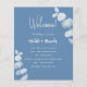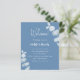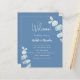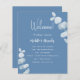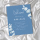 Um programa de casamento moderno, elegante, cronograma. Fundo azul empoeirado, decorado com eucalipto, prigs. Personalize e adicione seus nomes e detalhes do casamento. Se você tiver mais texto, é possível reduzir o espaço na linha e também adicionar texto no verso. 1 folha = 1 programa