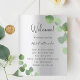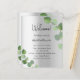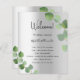 Um programa de casamento moderno, elegante, cronograma. Um fundo com aspecto de prata falsa, decorado com verde de eucalipto, galhos. Personalize e adicione seus nomes e detalhes do casamento. Letras pretas coloridas. Se você tiver mais texto, é possível reduzir o espaço na linha e também adicionar texto no verso.