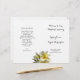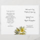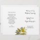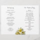 Programa de casamento dobrado com design de flores de plumeria amarela. Cor bruta com modelos de texto preto em quatro páginas - quando dobrada. O texto é impresso em ambos os lados deste papel de 8,5 x 11 polegadas, com atualizações opcionais, para criar um programa dobrado por folha. A primeira página tem o título, os nomes de cheio do casal e um local para data, hora e local da celebração. Inclua um parágrafo à família e amigos obrigados que aparecerão na parte de trás do programa. Sacudir o papel sobre e cria duas colunas de texto para "a cerimônia" ou "a ordem da cerimônia" e lista "a festa de casamento".