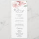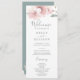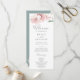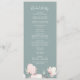 Este programa de casamento florescente de primavera cereja é perfeito para um casamento moderno. O design floral oriental apresenta um galho de árvore cor-de-água cor-de-rosa, branco e branco, e folhas verdes com estilo japonês elegante. Inclua o nome da noiva e do noivo, a data e o local do casamento, a mensagem do obrigado, a ordem do serviço, a festa noiva e um memorial "em memória amorosa" opcional.