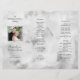 Programa de casamento floral, preto e branco, dobrado e com modelo fotográfico. Personalize três seções com texto preto. Adicione uma imagem do casal à esquerda / frente do programa. Flores brancas de hydrangea são a imagem de fundo.