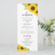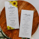 Este programa de casamento de girassol é perfeito para um casamento rústico. O clássico design moderno apresenta lindas flores silvestres amarelas brilhantes, com uma vintage no verão ou tema de outono. Inclua o nome da noiva e do noivo, a data e o local do casamento, a mensagem do obrigado, a ordem do serviço, a festa noiva e um memorial "em memória amorosa" opcional.
