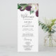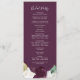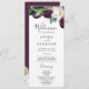 Este moody programa de casamento roxo é perfeito para um casamento moderno. O elegante design floral apresenta flores púrpura de ameixa escura e tulipas brancas com folhas verdes esmeraldas e sotaques dourados. Inclua o nome da noiva e do noivo, a data e o local do casamento, a mensagem do obrigado, a ordem do serviço, a festa noiva e um memorial "em memória amorosa" opcional.