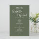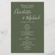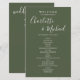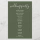 Programa de boas-vindas de casamento com o guião verde-oliva elegante, com nomes de estilo de assinatura. Personalize com os detalhes do dia do seu casamento em letras brancas chic. Projetado por Thisnotme©