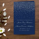 A coleção de casamento de confete azul e glam prata marinho é perfeita para qualquer casal planejando uma celebração romântica de casamento. O design apresenta um fundo azul marinho chic com um confete glam prata que é verdadeiramente espantoso e perfeito para qualquer evento especial. O texto incorpora a mesma cor prateada do design e pode ser facilmente personalizado para a sua ocasião de rico. Itens correspondentes podem ser encontrados abaixo..