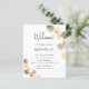 Um programa de casamento moderno, elegante, cronograma. Fundo branco, decorado com ouro eucalipto, prigs. Personalize e adicione seus nomes e detalhes do casamento. Letras pretas coloridas. Se você tiver mais texto, é possível reduzir o espaço na linha e também adicionar texto no verso.