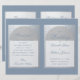 Um elegante programa de casamento dobrado com folha de prata falsa e azul empoeirado, uma cor muito moderna. Na frente, há arcos brancos em prata falsa contendo o texto, no verso, o texto está em retângulos brancos com bordas prateadas. O fundo é azul empoeirado, assim como o texto. Os títulos e os nomes da noiva e do noivo são escritos em uma elegante fonte caligráfica, o restante em letras maiúsculas. Para a festa de casamento no verso, a equipe da noiva e a equipe do noivo estão em colunas separadas.