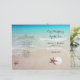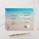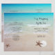 Programa de cerimônias de casamento de praia tropical. Água turquesa oceânica e areia lisa da praia são o fundo deste programa personalizado que será dobrado ao meio. A fonte casual em cinzas escuras é fácil de personalizar em quatro "páginas". Dólares de areia e condecoração de estrelas para representar o casal.