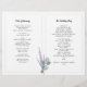 Programas de casamento dobrados com design de folhas de eucalipto. Mostrado em papel feltro, ou altere, com quatro "páginas" para personalizar. O papel de 21,5 x 28 cm será dobrado após a compra. Na página frontal, o título de exemplo, “Boas-vindas à cerimônia de casamento que une” com os nomes completos (como você escolher) da noiva e do noivo. Inclua data, hora e local ao longo da parte inferior. Decorado com um raminho de folhas cinza-azuladas. Dentro do programa, o lado esquerdo contém o texto para a “ordem da cerimônia” e “os membros do casamento”. Mais folhas e um raminho de lavanda decoram o centro interno. No verso do programa há um parágrafo para escrever uma mensagem pessoal aos convidados do casamento. Uma leve coroa de folhas é o fundo para