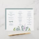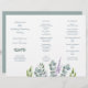 Eucalyptus dobrou a modelo do programa de casamento. Dobra como um acordeão para usar na cerimônia. Um pequeno spray de folhas de cinza azul decora a frente (painel do lado esquerdo) logo abaixo dos nomes do casal. Mais verde e um pedaço de lavanda "crescem" a partir da base do white paper. O reverso é cor azul-cinza sólida.