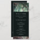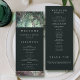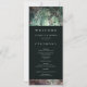 Uma ilustração com uma aquarela esbranquiçada da folhagem esmagadora em verde esmeralda e mauve e roxo, brilhante com luzes de fadas e poeira mágica, decora esta carta do programa de casamento outono de verão com um tema de floresta encantado. Perfeito para noivas que amam o cenário florestal de conto de fadas, o tema da floresta de fadas ou do jardim de fadas e esmeralda verde, mauve e ouro.