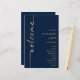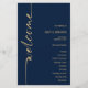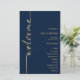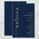 Programa de Caligrafia Elegante Marinho Azul e Dourado Casamento. Um tamanho de preço orçamentário de 5,5" x 8,5", um design tipográfico moderno com boas-vindas em um script set e rotacionado.