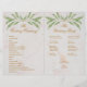 Um programa de casamento dobrado muito moderno, combinando múltiplas tendências: geométrico, mármore e metálico (ouro). O fundo é mármore branco. Ele tem folhas verdes e salgueiros decorados e um hexágono de ouro irregular ao redor do texto no cobrir da frente, com folhas salgueiras sobre ele, para cima, para a esquerda e para baixo, à direita. Há também pares de galhos salgueiros com folhas verdes no dentro superior da fronteira e sob o texto no cobrir traseiro. O texto tem cor de ouro, como o hexágono-ouro, e os títulos e os nomes da noiva e do noivo são escritos em um roteiro caligráfico elegante. Tem a cerimônia de casamento e a festa de casamento na dentro e uma obrigado que você manda no cobrir traseiro. Os ramos salgueiros são do padrão de papel de parede "Willow Bough", criado por William Morris (1834-1896 ), agora no dominio público.