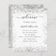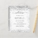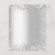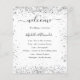 Na frente: Um programa de casamento moderno e elegante, linha do tempo. Um fundo branco decorado com falso brilho prateado, brilhos. Personalize e adicione seus nomes e detalhes do casamento. Letras pretas coloridas. Se você tiver mais texto, é possível reduzir o espaço na linha. Volta: fundo com aspecto sujo de prata e brilha.