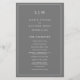 Programa de Casamento Simples com um design moderno, mas elegante, com seu monograma de duas letras no topo e seus detalhes cercados por uma fina fronteira. Todo o texto está em branco sobre um plano de fundo de cinza e pode ser alterado na ferramenta de edição de design. A frente tem sua ordem de cerimônia e a parte de trás tem sua festa de casamento e obrigado. Um design chic e na moda que é excelente para um casal minimalista. Estes programas de casamento baratos são impressos em folhas de papel para uma opção econômica.