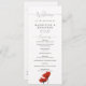 Duas papoilas vermelhas, desenhadas à mão em lápis de grafite e aquarela, decoram este elegante, preto, branco e vermelho, simples, clássico e moderno programa de cerimônias de verão. Apresenta caligrafia moderna e elegante com amplos florescimentos. Luxuoso, mas simples, clássico, mas chique, moderno, mas eterno. Uma escolha adorável para um casamento de verão, ou para uma cerimônia de um ano para um casal se casar em qualquer estação que goste da estética da arte negra e branca para a papelaria do casamento, flores silvestres ou papoilas.