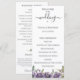Flores de aquarela roxa e galhos botânicos verdes, programa de casamento. O programa apresenta um acento de caligrafia fofa "casamento" com várias linhas para listas de texto personalizadas para a ordem dos eventos da cerimônia, festa de casamento e nota de agradecimento.