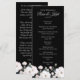 Um belo leito de rosas brancas no fundo deste elegante programa de casamento preto. Tipografia personalizável de cinzas de luz para detalhes do programa de casamento.