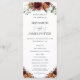 Projetado para coordenar com a nossa coleção de casamento Rustic Blooms, este elegante programa de casamento apresenta uma bela cor d'água enterrada, laranja queimada, pincel, rosas brancas de marfim, hífenes, estoques e arranjos verdes. Personalize-o com os detalhes do seu casamento de forma fácil e rápida, basta pressionar o botão personalizá-lo para reorganizar e formatar o estilo e a colocação do texto. Duplo lado. O Feliz Cat Studio
