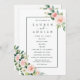Cartão de Programa de Casamento Elegante com flores pintadas à aguarela em rosa corado, branco e folhagem verde com uma moldura retangular. Para personalização mais avançada deste design, clique no link "Personalizar ainda mais".