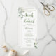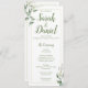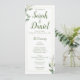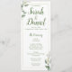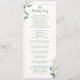 Um belo e simples programa de casamento com texto verde e flores verdes com flores brancas.