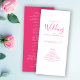 Este cartão de programa de serviço do dia de casamento apresenta uma elegante e bela fonte de script complementada com texto moderno em cor rosa-quente. Esta peça está pronta para você personalizar com os detalhes da sua cerimônia. Parte de uma coleção em crescimento constante, navegue na Elegant Pink Floral Watercolor Wedding Collection para obter itens correspondentes.