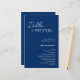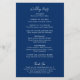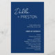 Programa de casamento azul marinho moderno com um design simples e minimalista com o nome da noiva em uma letra elegante e o nome do noivo em uma fonte sans serif contemporânea. Abaixo, no canto inferior direito, estão os detalhes do seu evento e a ordem da cerimônia em um layout minimalista. A parte de trás tem o seu cortejo e mensagem de agradecimento.