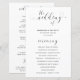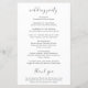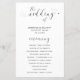 Programa de casamento de tipografia branca e negra com as palavras "o casamento de" com pestanas, um coração no final e ponteiro "i". Abaixo estão seus nomes, cidade, estado e data. A frente tem sua ordem de cerimônia e a parte de trás tem sua festa de casamento e obrigado. Estes programas de casamento baratos são impressos em folhas de papel para uma opção econômica.