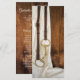 Dê aos seus hóspedes a ordem da sua cerimônia de casamento casual, mas elegante, ao estilo fazendeiro ocidental, com o encantador Programa de Casamento Ocidental de Satin Branco e Bit Horse. Este programa de cronologia de casamento do tema equino, rústico, personalizado, apresenta uma fotografia quintal e melhorada digitalmente de cebola branca, colar de pérolas brancas, rédeas de cavalo e de couro com um fundo de madeira de cascata castanha.