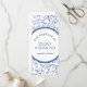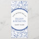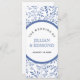 O índio azul deixa o programa de casamento padrão. Esta adorável design de modelo de casamento apresenta um padrão feito de folhas azuis e seu texto em um quadro branco redondo com contorno azul escalpado.
