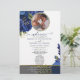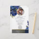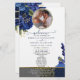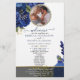 Pegue um programa de casamento único que você pode personalizar completamente para torná-lo especial e exclusivo para o seu casamento. o design vem com um quadro onde você pode colocar sua foto com seu homem ou com sua mulher, o quadro que vem com o miçanga complementará a foto do dentro casal e fará o cartão parecer tão elegante. Cartão de casamento moderno com sotaque azul e dourado.