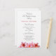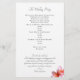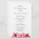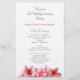 Programa de casamento plano com flores de plumeria rosa. Livro branco com modelos de texto de ambos os lados para uma cerimônia de casamento tradicional. Na frente, inclua um título e nomes do casal. Liste a ordem da cerimônia. No verso, listem a festa de casamento, oficial, pais e avós, e incluam um parágrafo de obrigados do casal. Também se podem referir aqueles que se amaram e que passaram. Escolha um tipo de papel favorito.