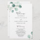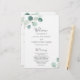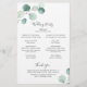 Elegante programa de casamento com um simples design com aquarela pintada com eucalipto verde-sábio no canto superior esquerdo e canto inferior direito. O lado frontal tem a sua ordem de cerimônia e o lado de trás tem a sua festa de casamento e obrigado. Estes programas de casamento botânico apressados com uma reviravolta moderna são perfeitos para um casamento de primavera ou verão. Estes programas de casamento baratos são impressos em folhas de papel para uma opção econômica.