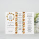 O triplo programa de casamento com tulipas de laranja-aquarela, no verso do cartão, é uma coroa floral primavera complementar opcional. Observe que a alteração do tipo de papel pode dificultar o dobramento do programa.