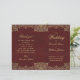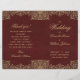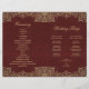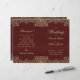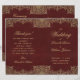 Um elegante programa de casamento dobrado com um ar vintage, tendo em ambos os lados duas elegantes decorações douradas vintage nas bordas (para cima e para baixo). Os títulos e os nomes da noiva e do noivo são escritos em uma elegante fonte caligráfica, o restante em letras maiúsculas. O fundo é vermelho bordô, o texto é dourado, semelhante às decorações douradas nas bordas. Para a festa de casamento no verso, a equipe da noiva e a equipe do noivo estão em colunas separadas.