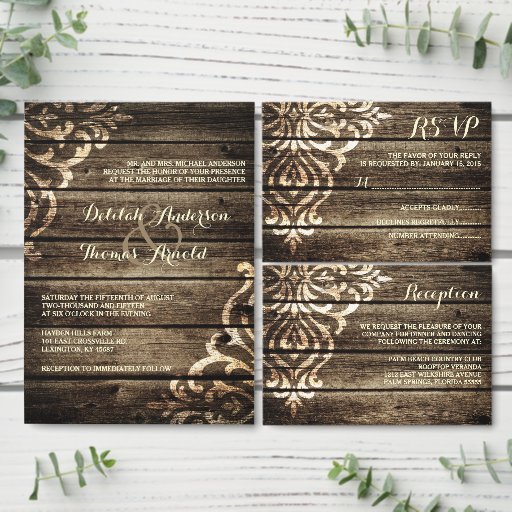 Este programa de casamento rústico mostra uma madeira de celeiro aflita, com um design branco desbotado queimado na madeira. A mistura perfeita de materiais rústicos com a elegância de damask detalhando. Perfeito para o casamento do celeiro, casamento ao ar livre, casamento no campo, casamento rústico, casamento vintage ou casamento elegante.