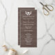 Vintage, modelo de casamento chic country de madeira castanha escura. Design de veado com corações românticos e tipografia de na moda. Fundo do painel do celeiro de madeira com texto branco. Personalize o que deve estar em seu programa. Cartazes de casamento de tendências para noiva e noiva de classe. Incluir nomes, data, local, ordem da cerimônia e festa de casamento. Parte do conjunto de temas de caça combinando com acessórios de noiva e outros suprimentos de chique.