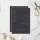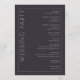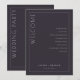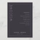 Este elegante programa de casamento apresenta um design minimalista com fundo cinza escuro e tipografia moderna e limpa. O layout é orientado verticalmente, dividido por uma linha branca fina, criando duas seções: uma para o acolhedor "BEM-VINDO" em fonte serifada grande e outra listando os eventos da cerimônia em um estilo sans-serif centralizado. Espaços personalizáveis permitem a personalização com nomes e datas, tornando-o perfeito para celebrações formais. O clima geral é sofisticado e antecipatório, ideal para um evento memorável.