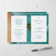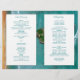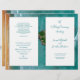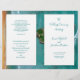 Modelo do programa de casamento dobrado com texto pronto para uma cerimônia católica. O fundo é a água azul-lacrimogênea com alguma terra se mostrando e areia da praia à esquerda. Os painéis brancos seguram as modelos de texto para criar uma aparência em camadas. A última página (verso do programa quando dobrado) inclui uma seção para a escritura (amostra é "O amor é paciente, o amor é gentil" de 1 Corinthians) e uma mensagem da noiva e do noivo. Um estilo de fonte de script manuscrito é combinado com texto impresso para criar um programa moderno e fácil de ler.