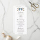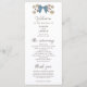 Coquete e programa de casamento rústico com ilustração desenhada à mão de arcos e flores azuis e amarelas. Todas as informações da cerimônia de casamento e o nome da festa de casamento listados neste programa.