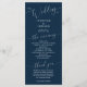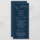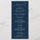 Programa de casamento mínimo com fontes modernas em um fundo azul marinho. Todas as informações da cerimônia de casamento e o nome da festa de casamento listados neste programa.