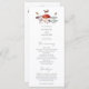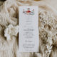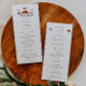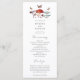 Programa de casamento russo com ilustração aquosa de cogumelos e mariposas. As informações da cerimônia de núpcias e os nomes das festas de casamento estão listados neste programa.