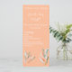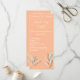 Adicione um toque de encanto moderno à sua cerimônia com este elegante programa de casamento de pêssego. Apresentando sotaques florais de cor aquosa suave e roteiro branco contemporâneo, este programa de lado duplo inclui espaço para detalhes da cerimônia e sua linhagem de festas de casamento. Perfeito para casamentos de primavera ou verão, este programa coordena-se lindamente com os temas do casamento de pêssego, terracota e pastel. Personalize facilmente todo o texto para corresponder ao seu dia especial.