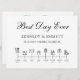 Este programa moderno e elegante da timeline do dia do casamento para um casamento na praia ou perto dela com ícones que permitem a todos saber quem está na festa de casamento, o fluxo da tarde/noite, e uma nota especial de obrigados para os convidados é fabuloso! É simples, moderno, e as fontes são limpas e fáceis de ler. As horas podem ser mudadas para que você possa personalizar facilmente este programa para o seu casamento.