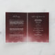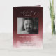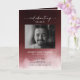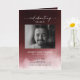 Programa memorial funerário com uma fotografia do falecido, seu nome, datas, local memorial, data do evento, e uma elegante névoa vermelha escura. Na dentro está um obituário, e a ordem de serviço; e atrás de outra foto, uma nota de agradecimento e o segundo lugar para depois do funeral. Para mais personalização, clique no link "Editar usando a Ferramenta de Design" e use nossa ferramenta design para modificar esse modelo. Se precisar de ajuda ou itens correspondentes, entre em contato comigo.